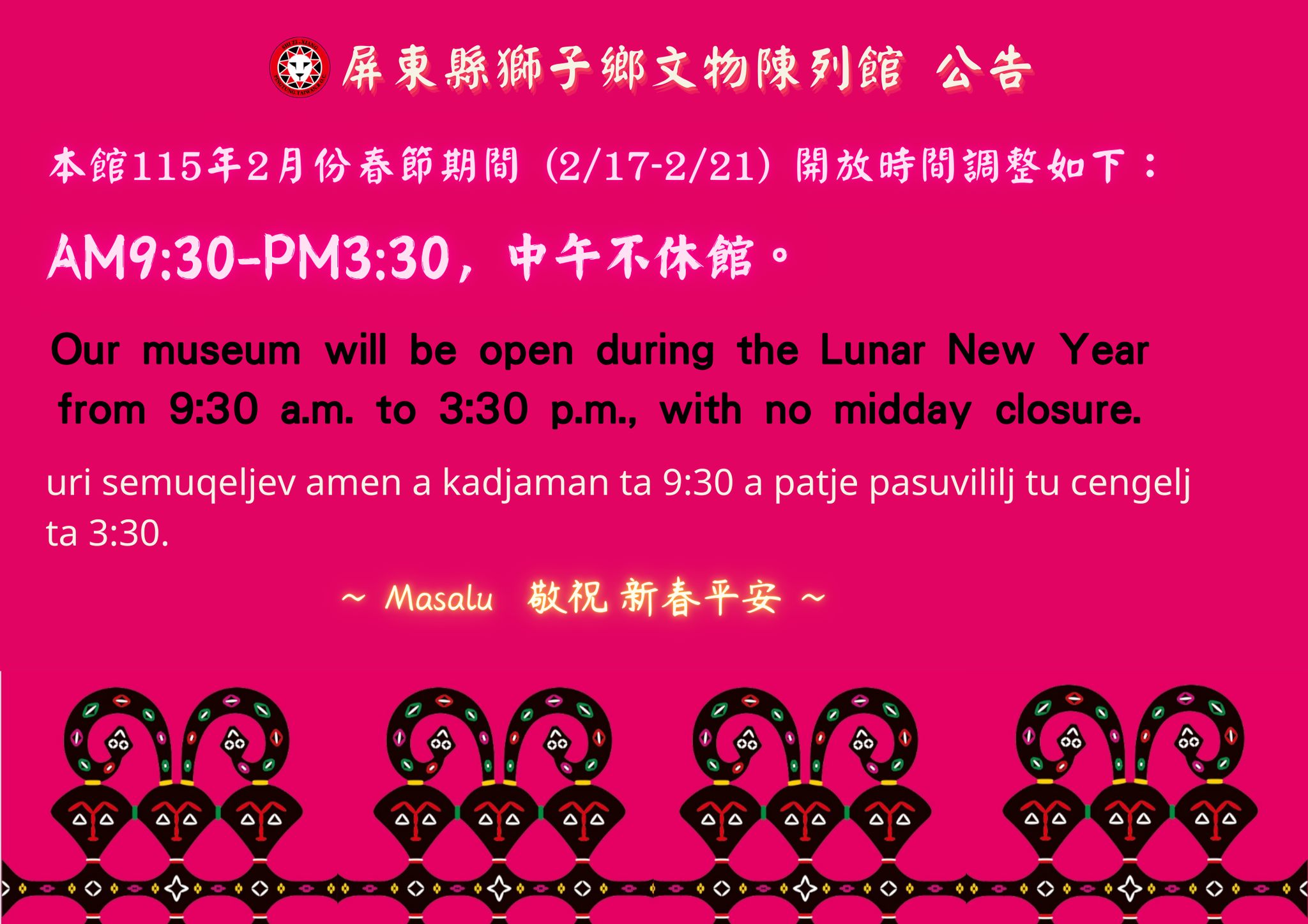 「Ki cacepeliw 從海那邊.歡迎回家—瑞典國家世界文化博物館典藏排灣族百年文物重返獅子鄉特展」,春節期間正常開館